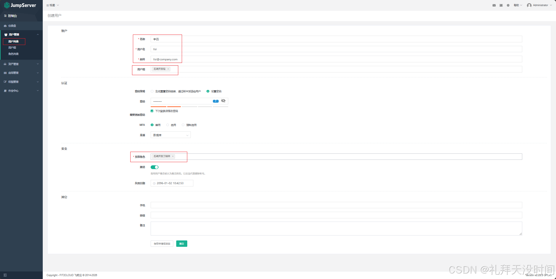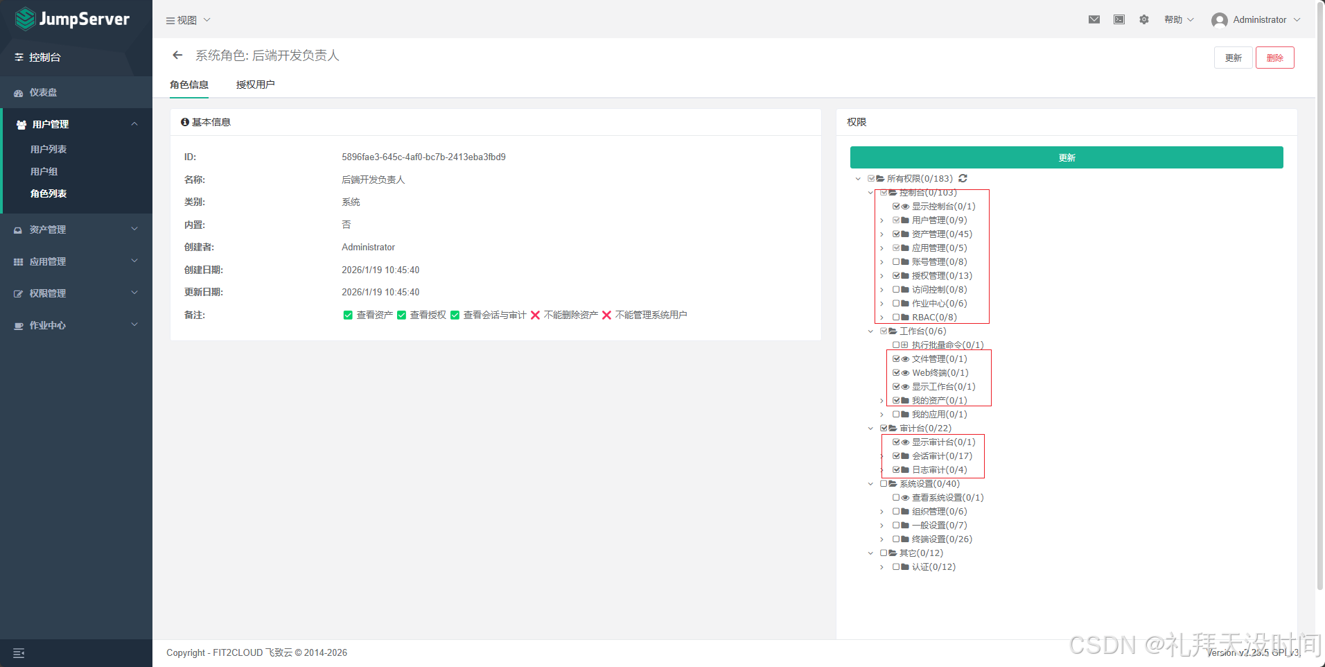 - 后端开发负责人:拥有查看资产、授权、会话审计的权限,但不能删除资产、管理系统用户。