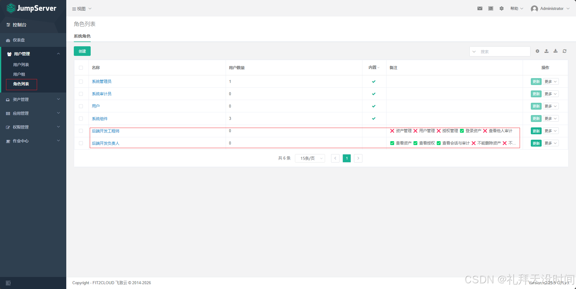 JumpServer默认有管理员、审计员等角色,但我们可以自定义更细粒度的角色。