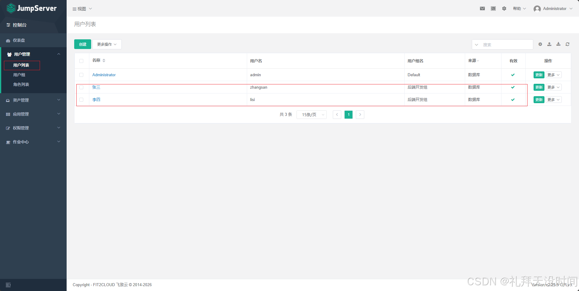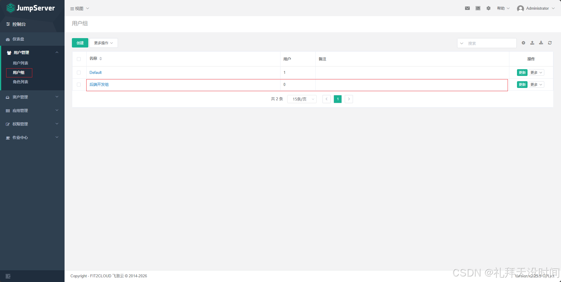 假设我们有一个后端开发团队,包含负责人(有部分管理权限)和普通开发(仅能登录指定的服务器)。我们通过JumpServer来实现权限隔离。