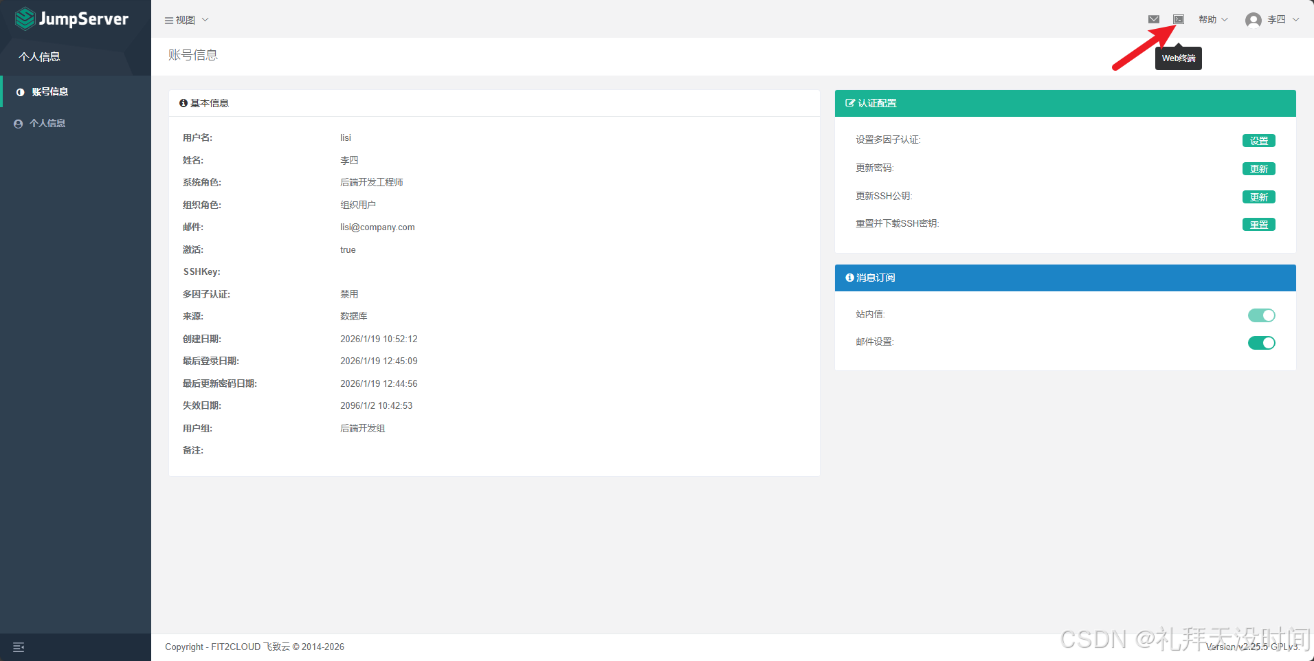 用李四账号登录JumpServer Web界面,进入"工作台",可以看到授权给他的资产列表。