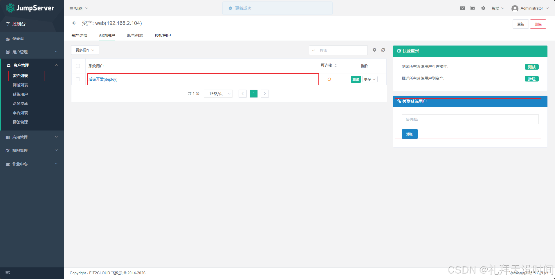 进入资产的详情页,点击"添加系统用户",选择刚创建的 deploy,并测试连接性。