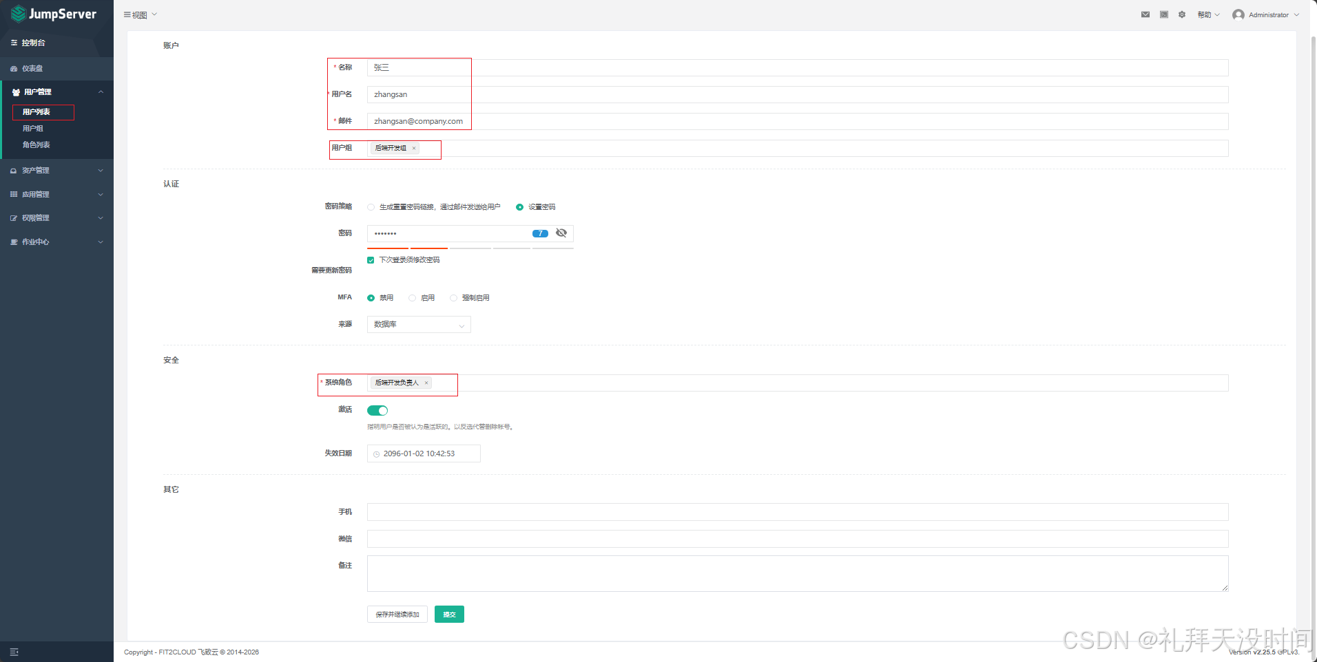 用户名:zhangsan,姓名:张三,邮箱:zhangsan@company.com,加入后端开发组,角色选择"后端开发负责人"。
