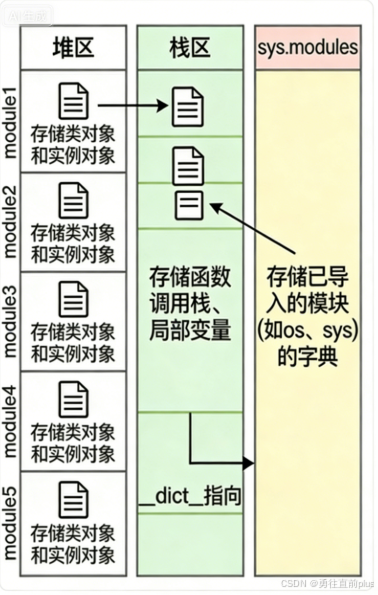 - sys.module 是堆区的一块缓冲区,是个字典,存储所有module对象,key是模块名、value是module对象的引用地址