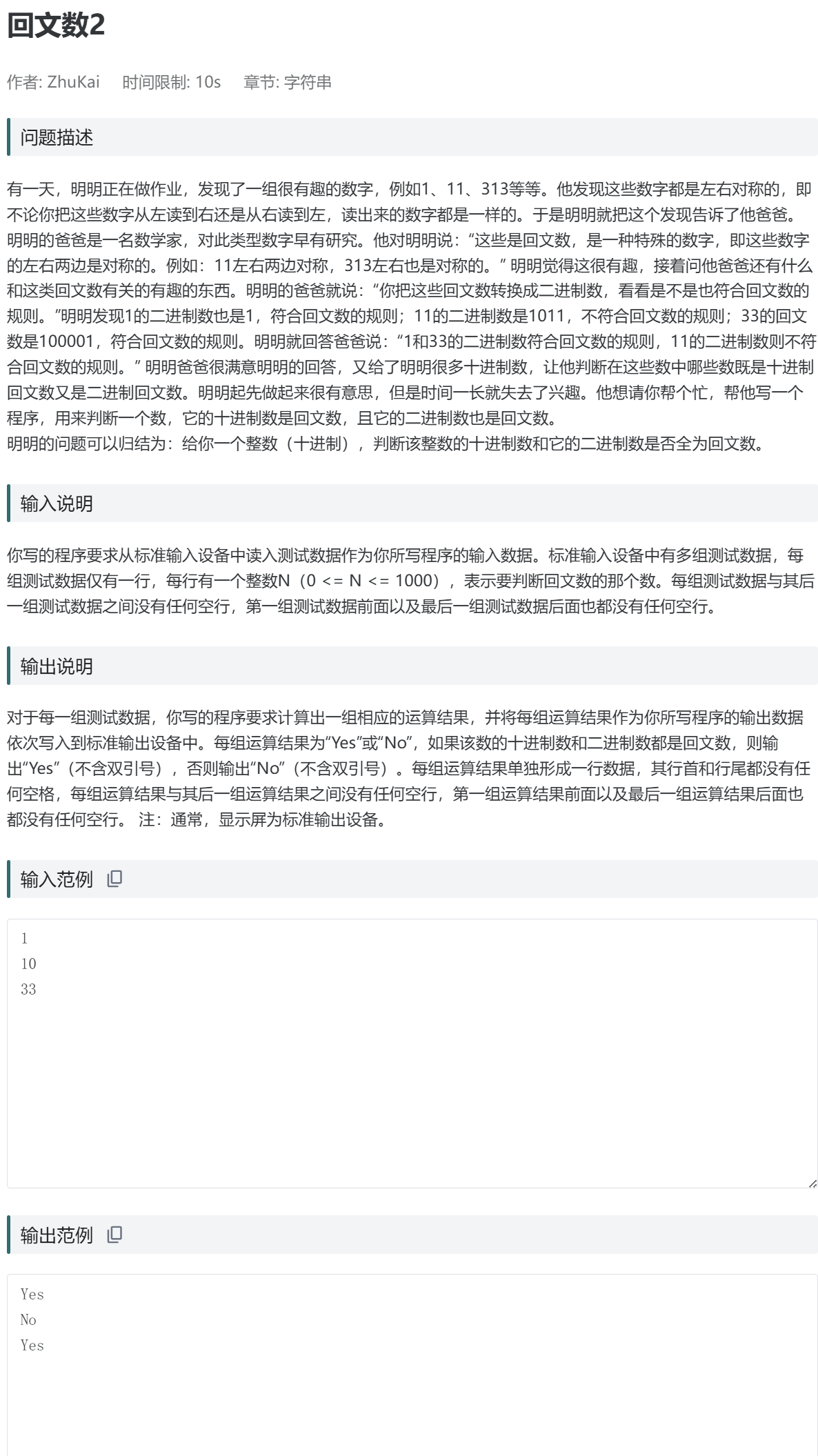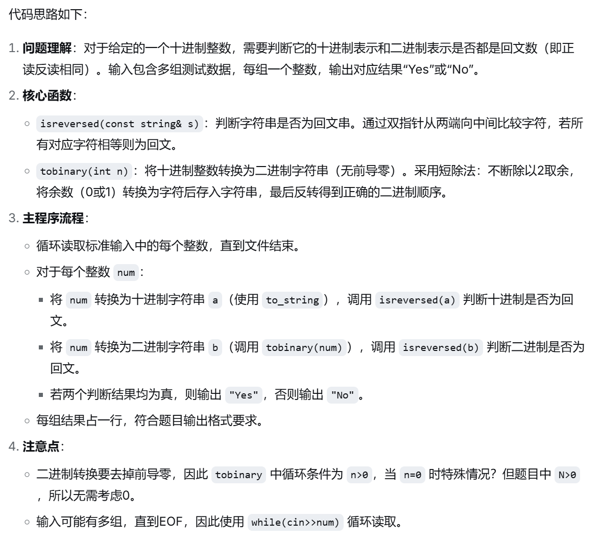 这道题有两个核心的地方,一个是判断字符串是否为回文串,可以通过双指针从两端向中间比较字符,相等则为回文;还有一个是将十进制整数转为二进制字符串,采用短除法,最后反转得到正确的二进制顺序。