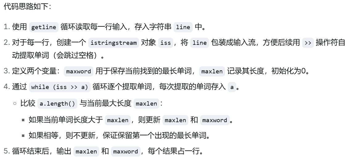 这道题主要是用到istringstream,它的作用是将一个字符串包装成一个输入流对象,我们通过getline(cin,line) 读取了一整行文本,这行文本包含多个单词,单词之间可能有多个空格。如果直接处理这个字符串,手动拆分单词会比较麻烦(需要自己遍历字符、判断空格边界)。而istringstream 可以帮我们省去这些麻烦------我们只需把这一行字符串交给它,然后像从键盘输入一样用 >> 连续读取,就能自动得到一个个被空格分隔的单词。设置两个变量来保存最长单词和其长度,每个单词进行比较,大于则更新。
