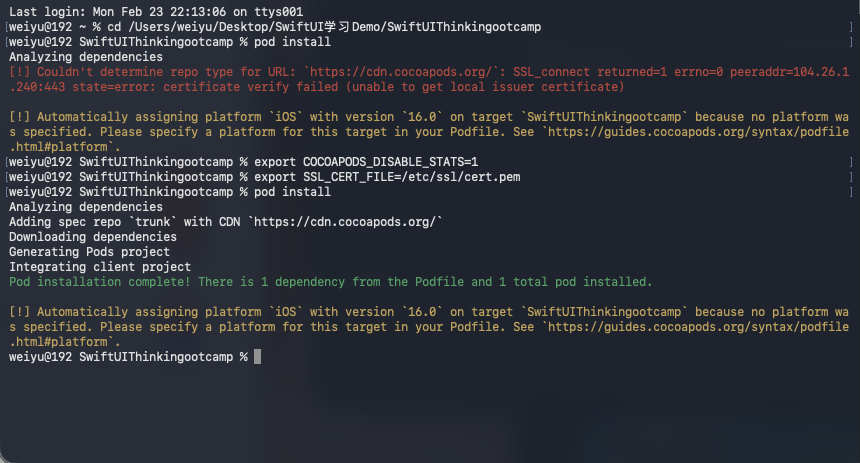 执行以下命令以禁用 CocoaPods 统计信息并设置 SSL 证书: