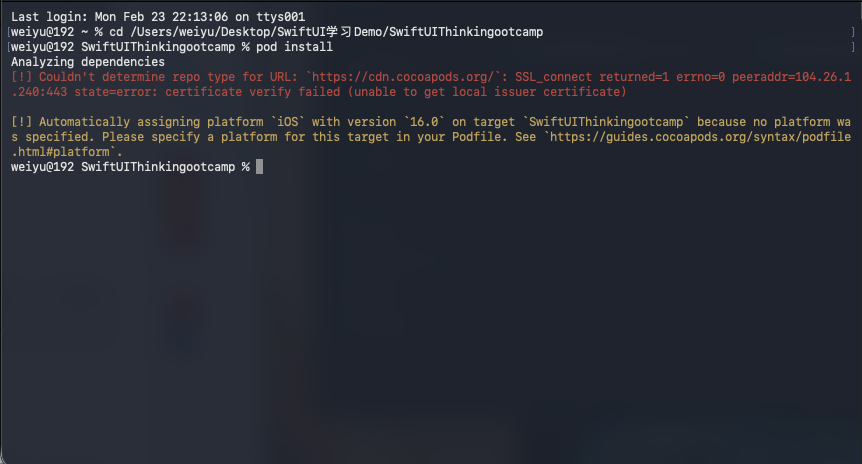 [!] Couldn't determine repo type for URL: `https://cdn.cocoapods.org/`: SSL_connect returned=1 errno=0 peeraddr=104.26.1.240:443 state=error: certificate verify failed (unable to get local issuer certificate)