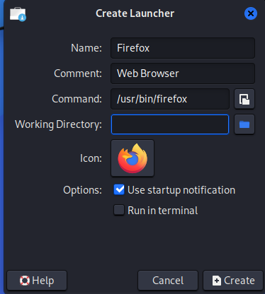 其次,填写"Name"为Firefox,comment为WebBrowser,Command为前面设置过的/usr/bin/firefox,Icon为firefox,Options勾选第一个就行(启动时会弹出提示,run in terminal不要勾选会启动时把你拉进powershell黑框框)