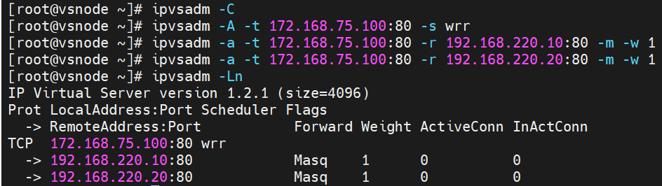 | vsnode | 调度器(VS) | eth0:192.168.220.100(dip) eth1:172.168.75.100(vip) | dip:内网通信地址,用于与 RS1、RS2 交互,接收 RS 的响应状态,转发客户端请求给 RS vip:对外服务的虚拟 IP,客户端访问的目标地址,配置在调度器上接收请求 |