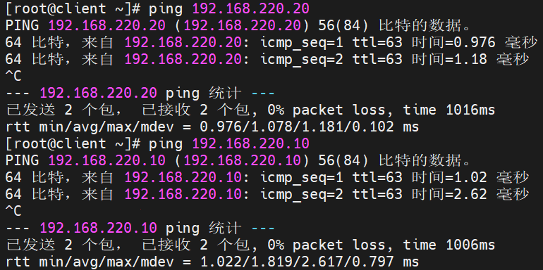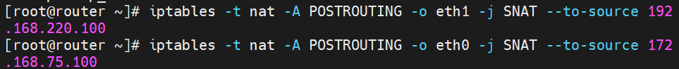 | router | 路由器/网关 | eth0:172.168.75.100(vip) eth1:192.168.220.100(dip) | vip:充当客户端与集群之间的路由器,负责将目标 IP 为 VIP 的请求路由到调度器。eth0 配置了VIP,对外接收客户端请求。 dip:作为调度器的网关,连接内网 RS,转发经调度的请求给 RS |