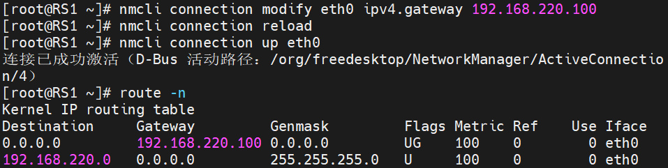 给 RS1 和 RS2 设定网关(命令是一样的):