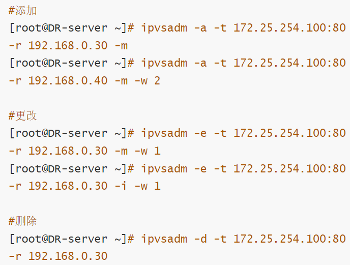 ipvsadm -a|e -t|u|f service-address -r server-address [-g | -i| -m](工作模式) [-w weight](权重)