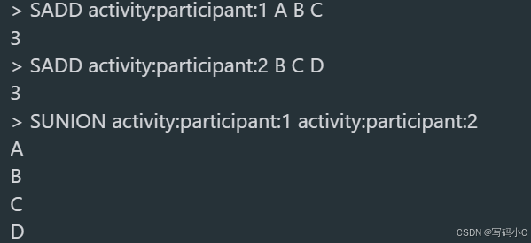 SUNION activity:participant:1 activity:participant:2 # 返回结果:A、B、C、D