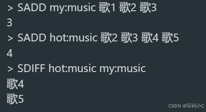 SDIFF hot:music my:music # 返回结果:歌4、歌5(可推荐的新歌)