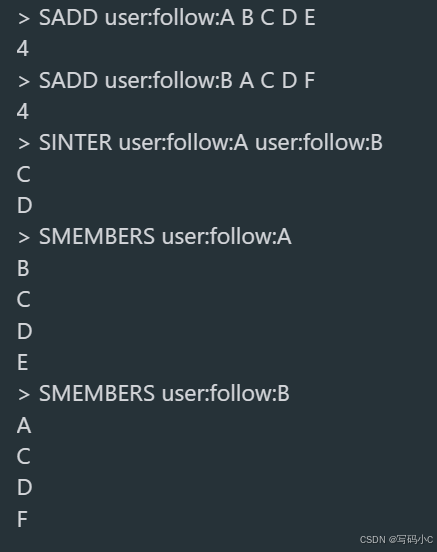 SADD user:follow:A B C D E # 用户A关注:B、C、D、E