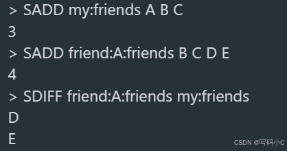 SDIFF friend:A:friends my:friends # 返回结果:D、E(可推荐给我的好友)