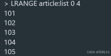 redisLRANGE article:list 0 4 # 返回 [101, 102, 103, 104, 105]