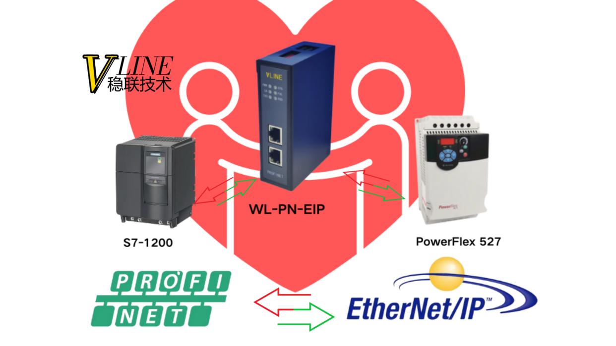 S7-1200──(PROFINET)──►[稳联网关]──(EtherNet IP)──►PowerFlex527