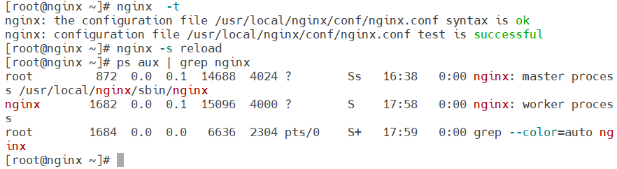 nginx -t:对 /usr/local/nginx/conf/nginx.conf 进行语法检查,验证配置是否合法