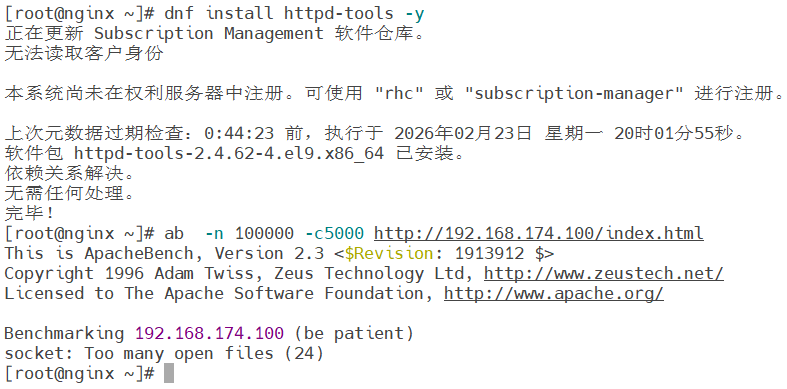 Too many open files报错,证明你之前的ulimit临时调整、limits.conf配置及 Nginx 调优全部生效。 - 测试正常推进 :压测工具