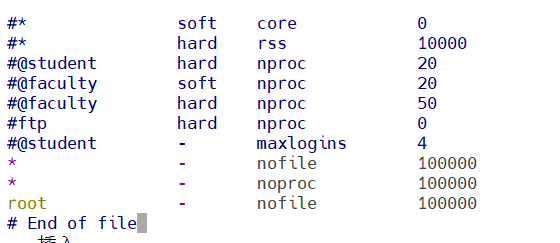 | root - nofile 100000 | 对 root 用户单独设置,最大文件句柄数同样为 100000 | 确保 root 启动的 Nginx 主进程及压测工具(ab)不受文件句柄限制 |