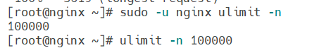 100000:说明nginx用户的限制已经成功提升到了 100000,这保证了 Nginx 的 worker 进程在处理大量并发连接时不会因为句柄不足而报错。