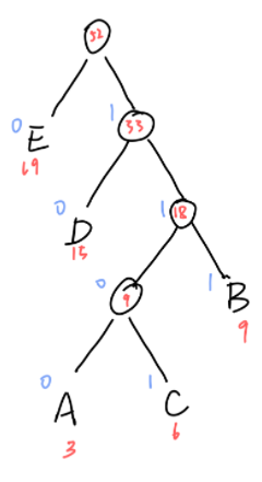 这种编码虽然很好想也很简单但实际上可能会占用大量空间,聪明的你肯定想到,让个数多的字母用少的空间,让个数少的字母用多的空间,比如E用0表示,D用1表示,A用100来表示