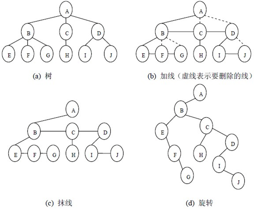 1 若某结点的左孩子结点存在,将左孩子结点的右孩子结点、右孩子结点的右孩子结点......都作为该结点的孩子结点,将该结点与这些右孩子结点用线连接起来;