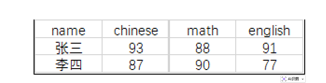-- 行转列后:name, chinese, math, english