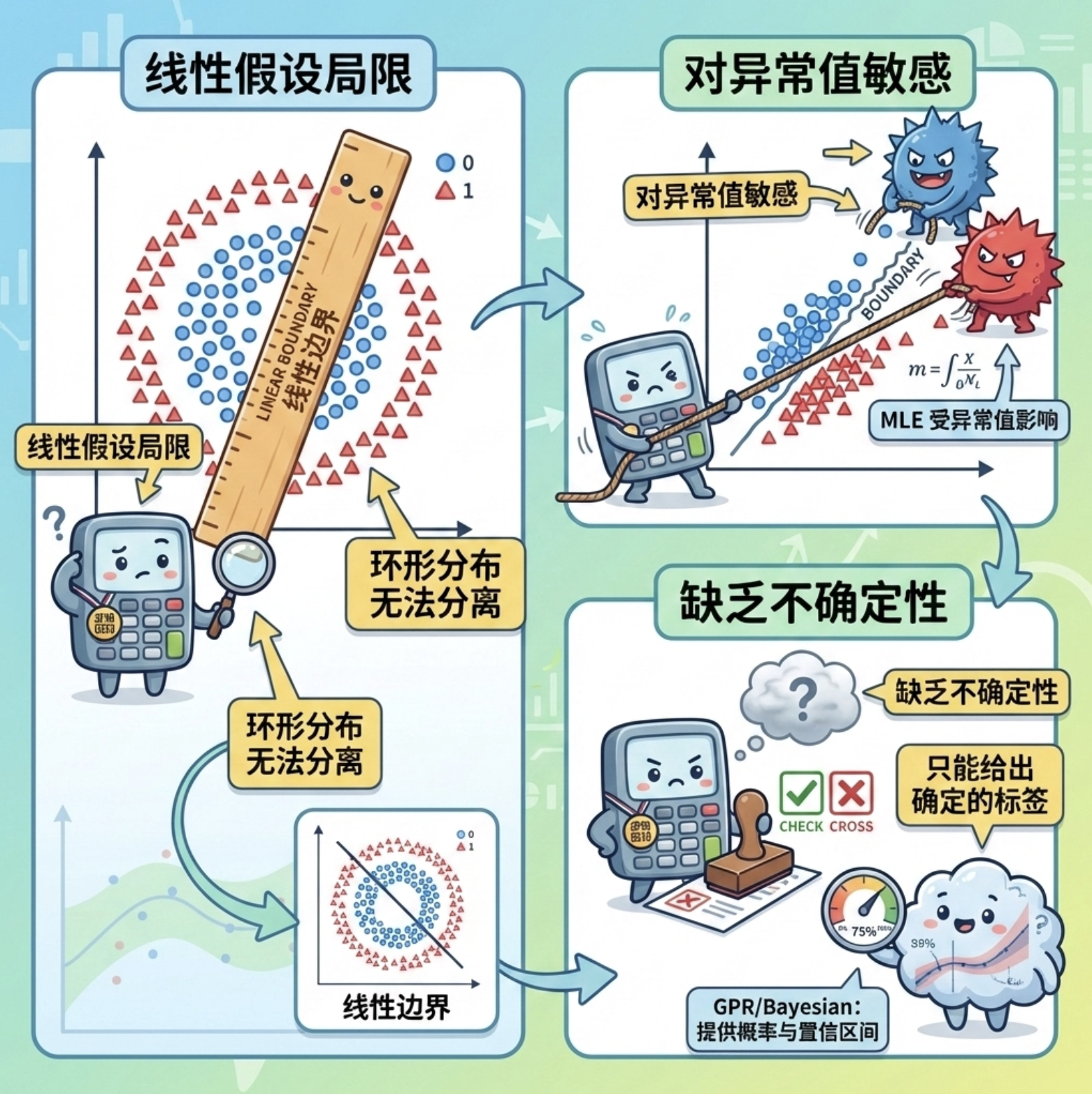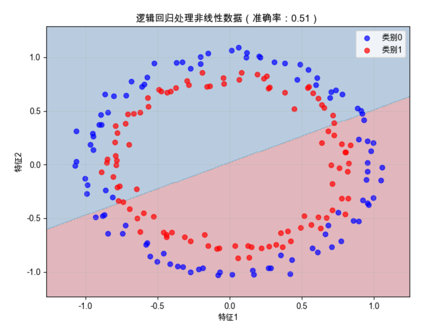 1.线性假设局限 :它只能学习线性决策边界 ------ 如果样本是 "环形分布"(比如类别 0 在圈里,类别 1 在圈外),逻辑回归完全无法正确分类;