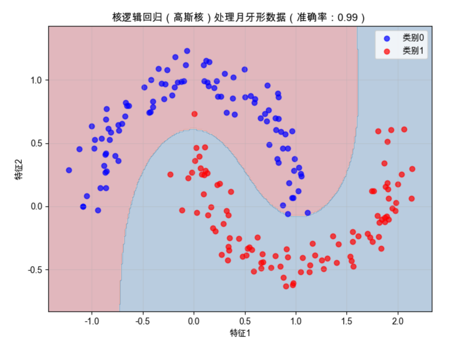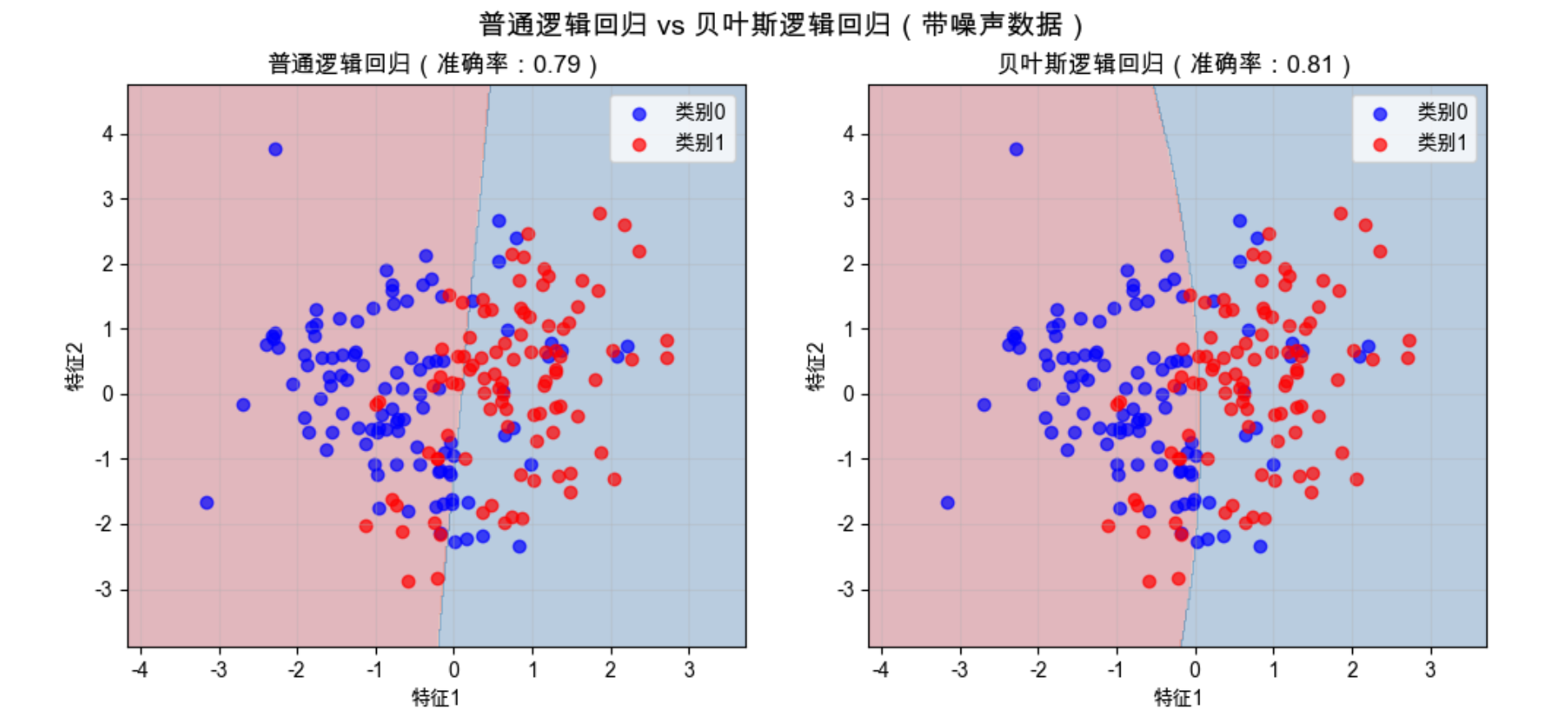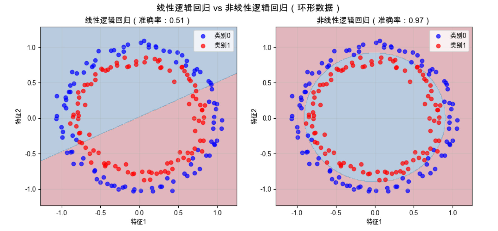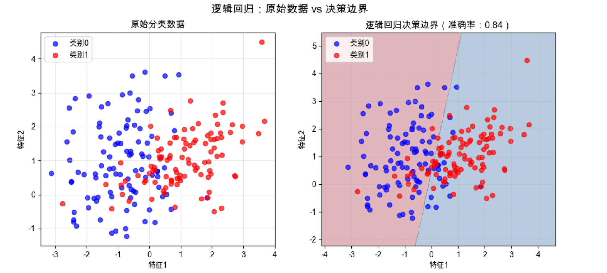 - 右图:逻辑回归学到的决策边界(浅蓝 / 浅红背景是模型预测的类别区域),边界能清晰分隔大部分样本。