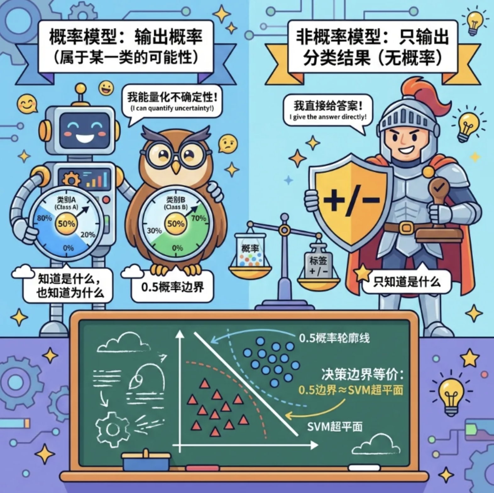 2.概率模型(逻辑回归 / 贝叶斯逻辑回归)输出分类概率,非概率模型(SVM)只输出分类结果,按需选择;