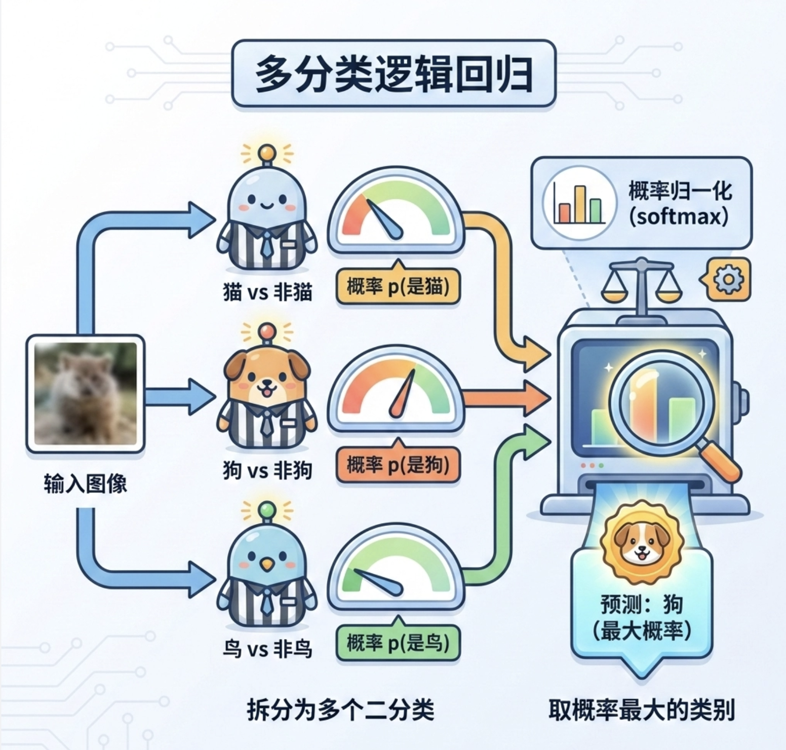 逻辑回归是分类任务的 "入门神器",虽然名字里带 "回归",但干的是 "分类" 的活。你可以把它理解成一个 "二选一裁判":给定一张图片的特征,它会判断这张图是猫(1)还是狗(0)。