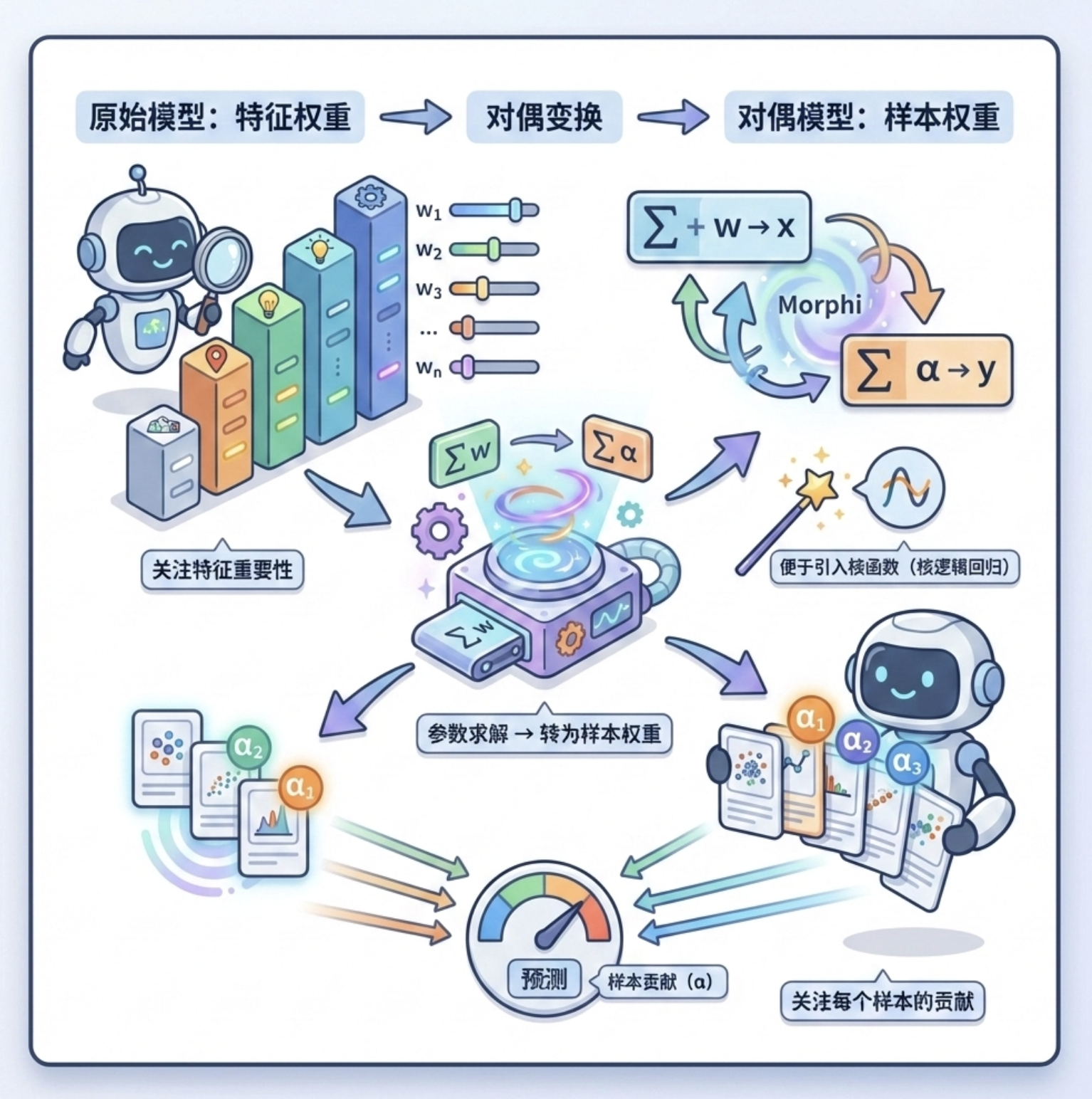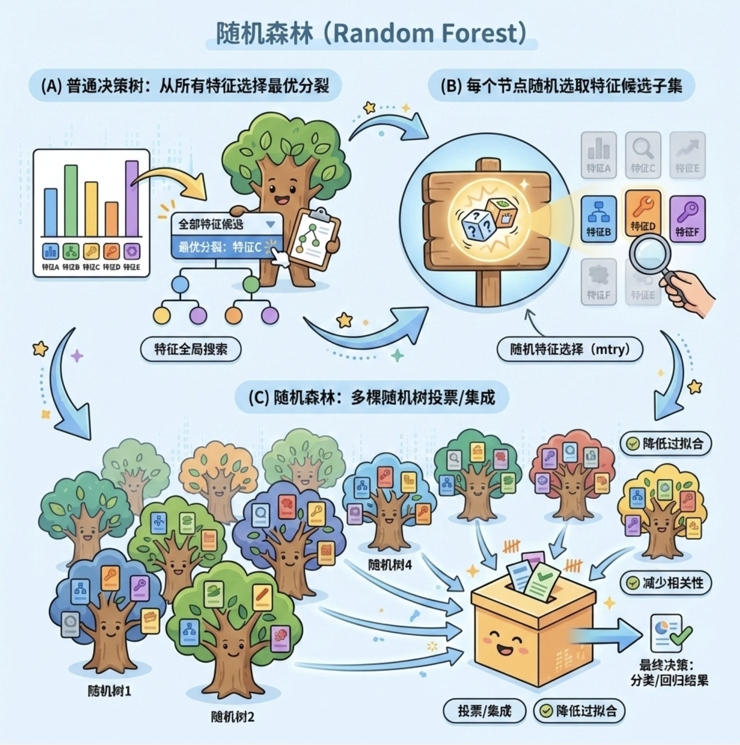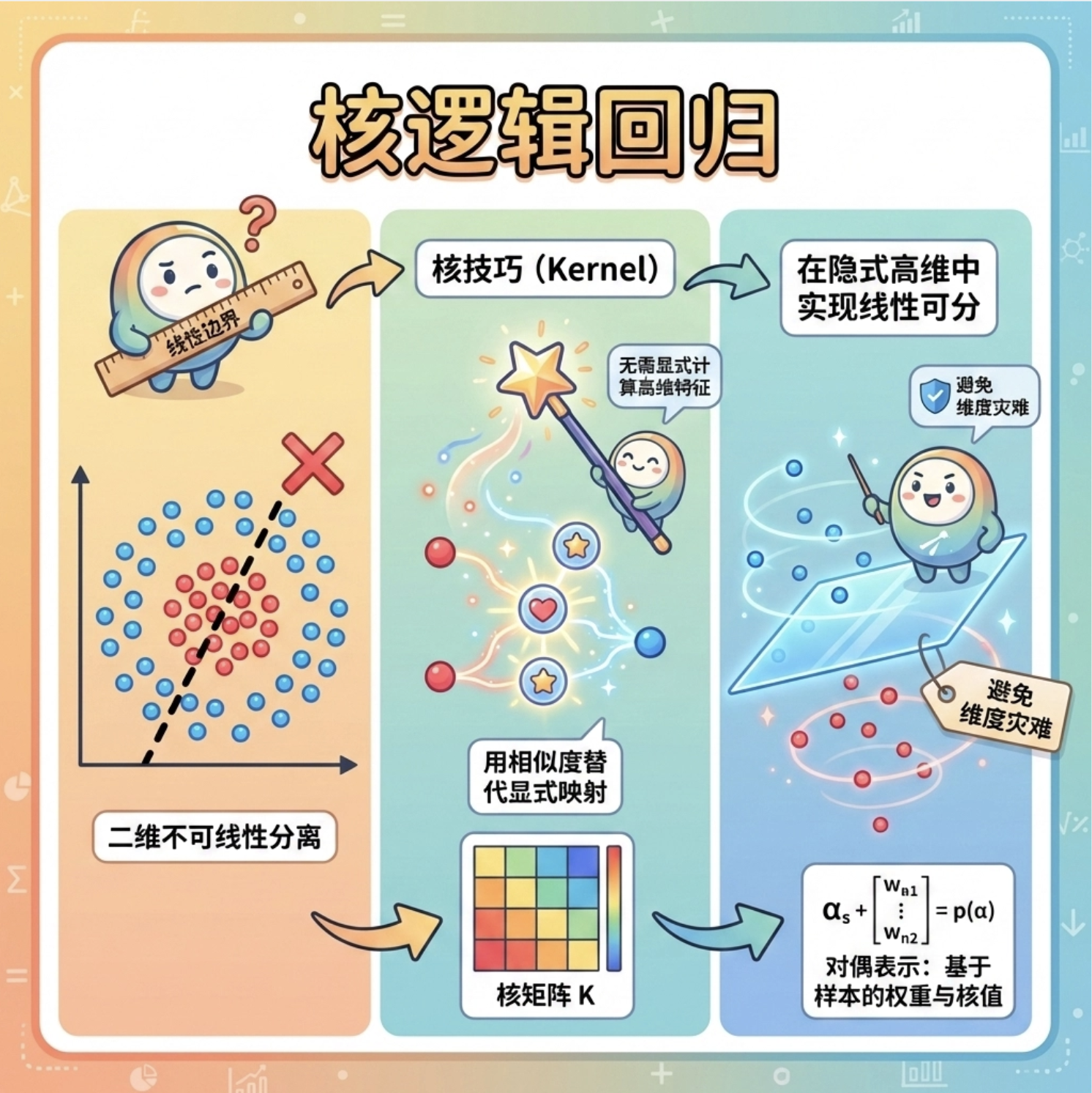 2.过拟合问题:随机森林通过 "多树投票" 缓解过拟合;贝叶斯逻辑回归通过 "先验知识" 避免过拟合;核逻辑回归需控制核函数复杂度。