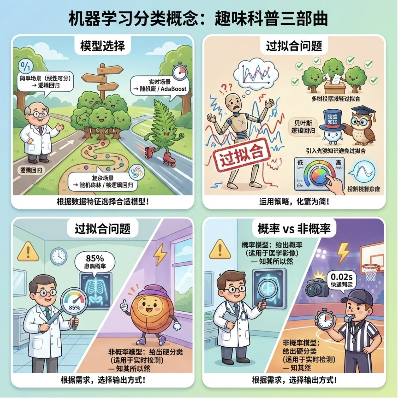 3.概率模型 vs 非概率模型:需要知道分类不确定性(比如医疗影像诊断)用概率模型;追求速度(比如实时视频检测)用非概率模型。