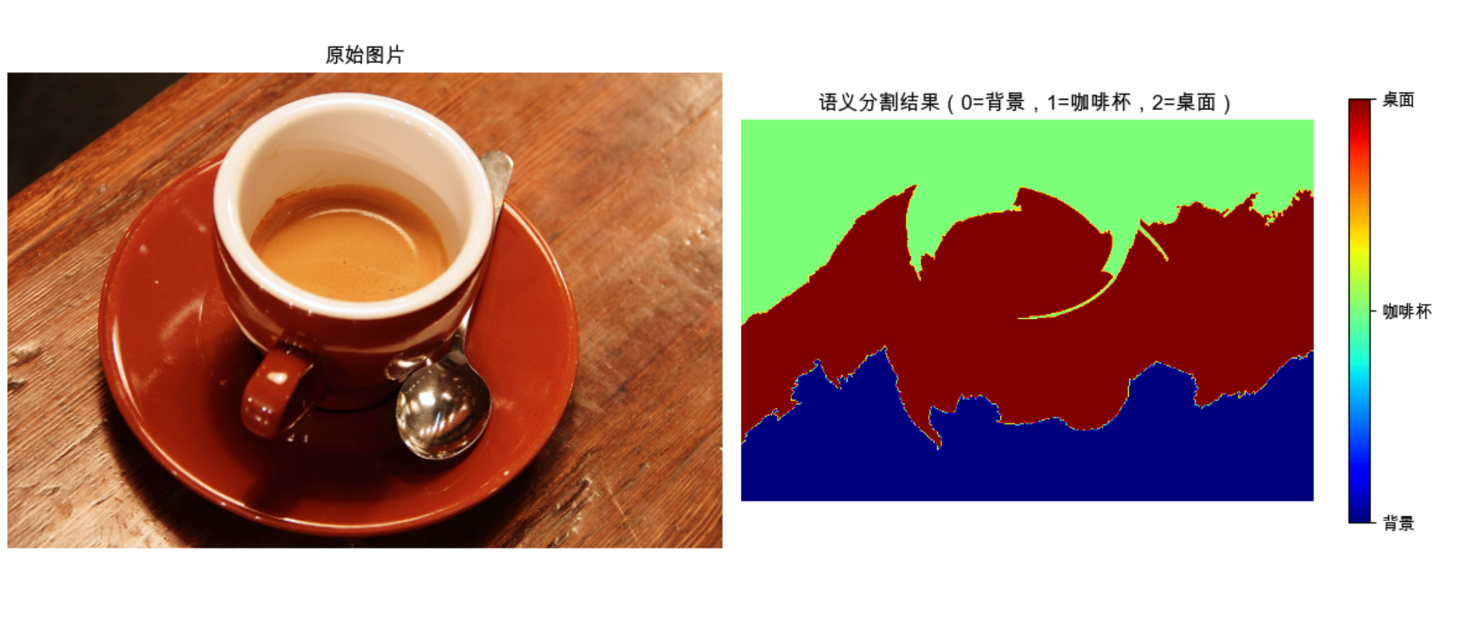 ax2.set_title('语义分割结果(0=背景,1=咖啡杯,2=桌面)', fontsize=12)