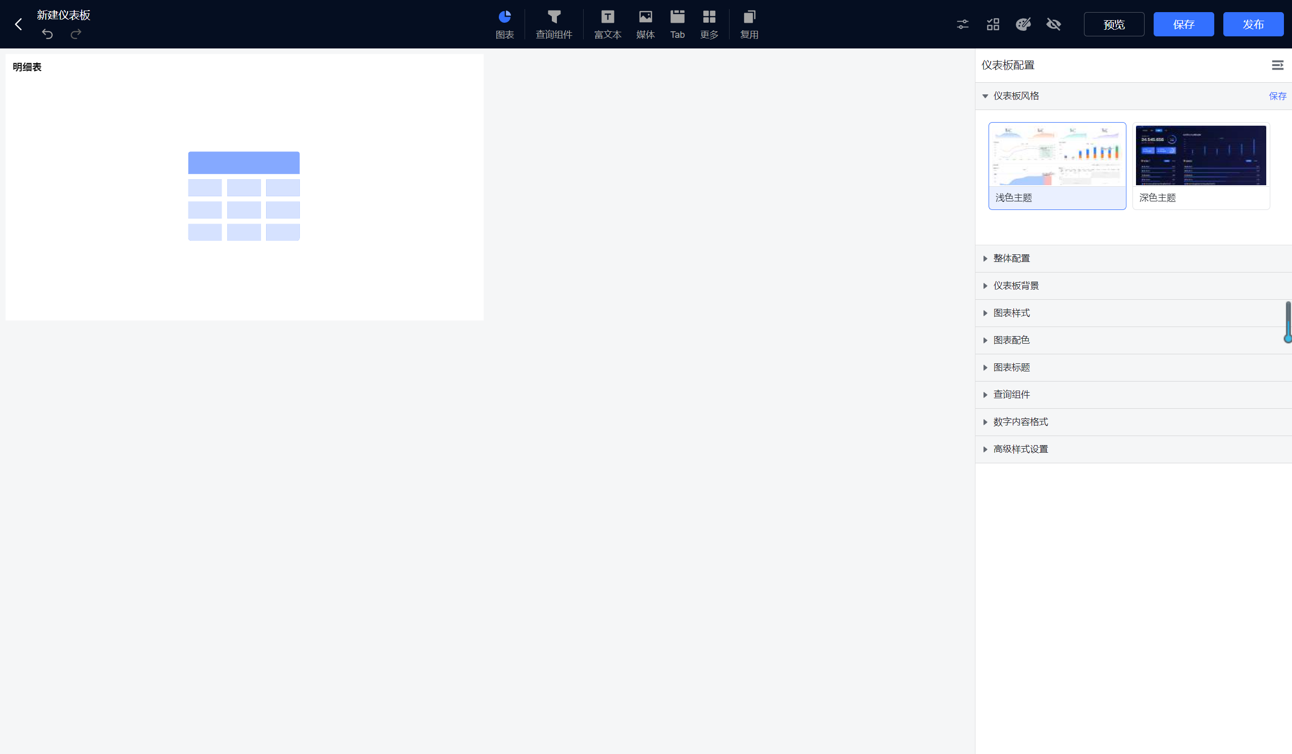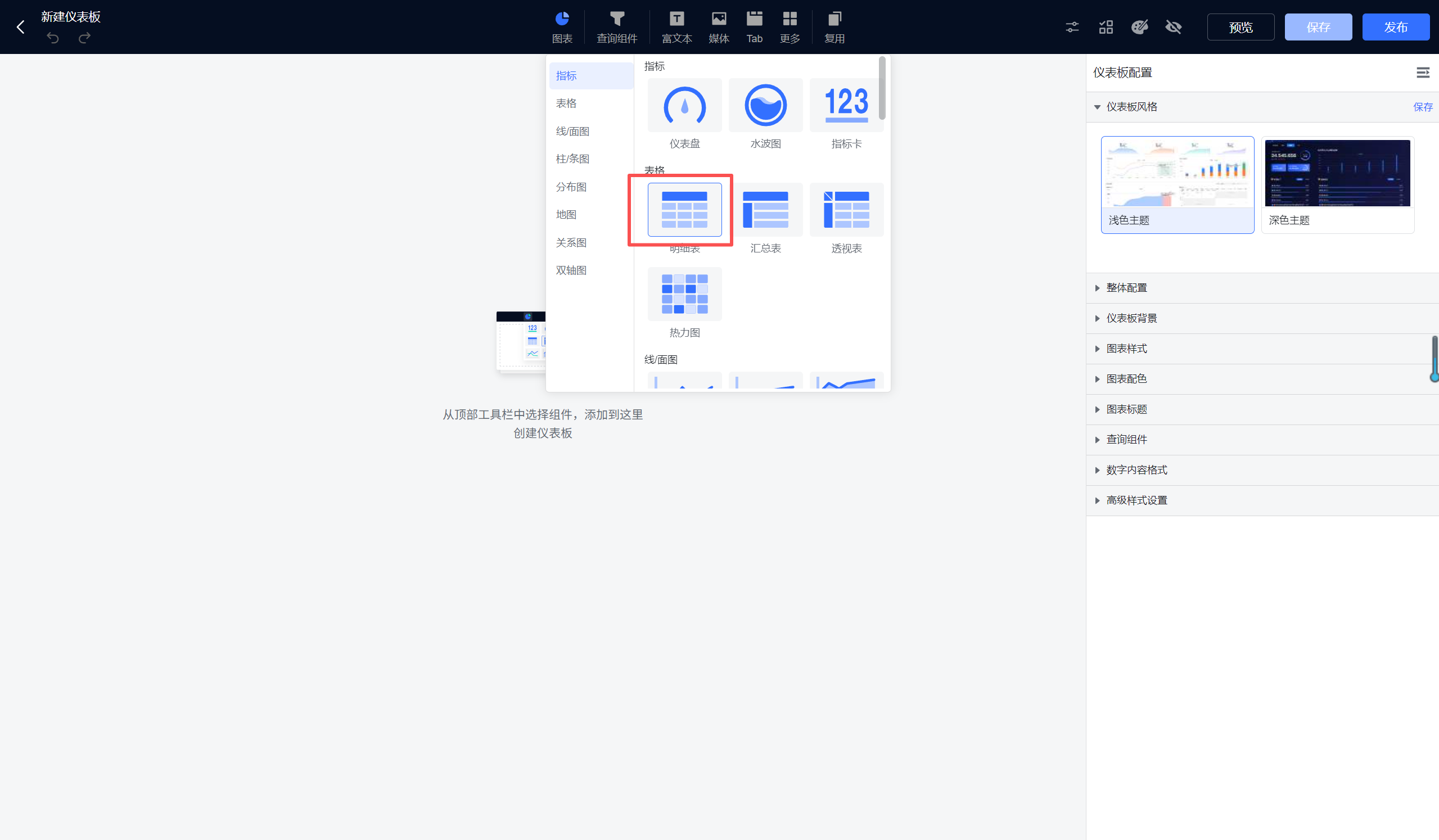 2. 添加图表 :从组件库中选择所需的 图表类型 (明细表、柱状图、折线图等)并添加到画布。