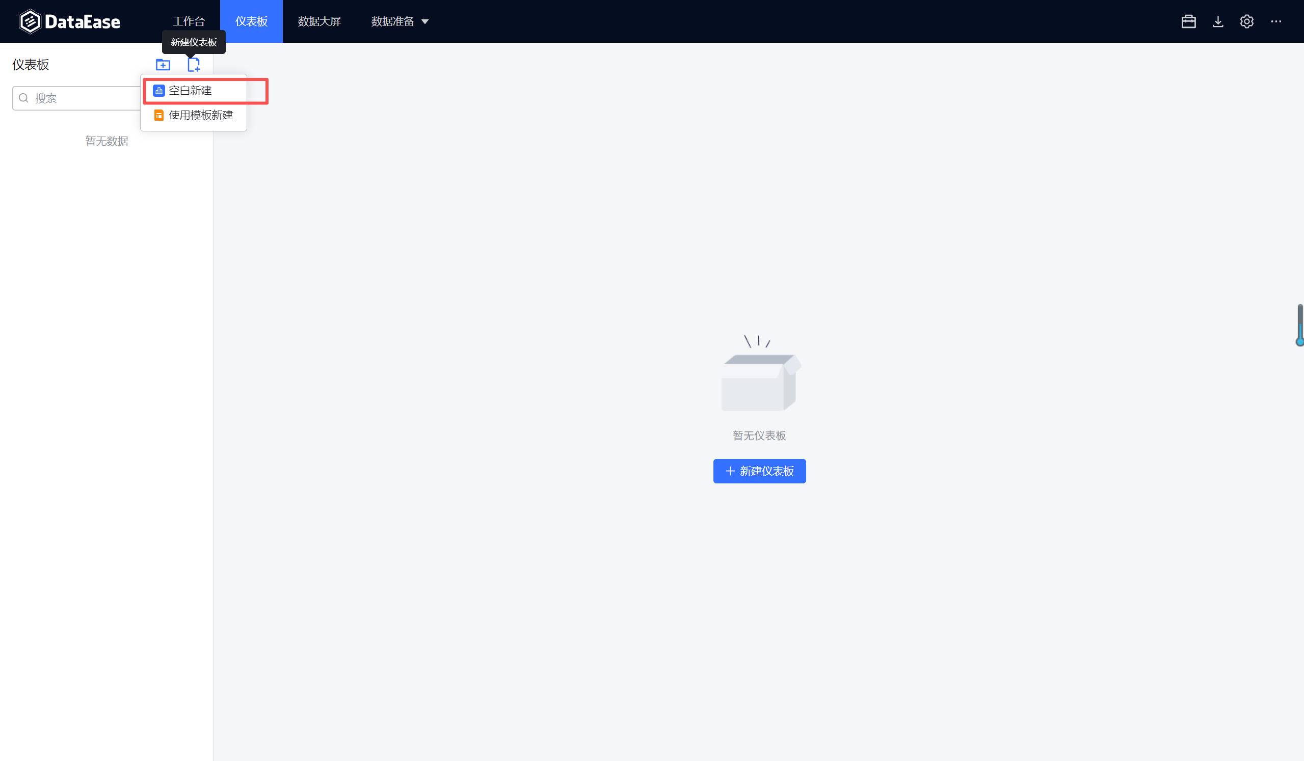 - 在弹出的选项中,点击 【空白新建】 。这将创建一个完全空白的仪表板画布,供您自由设计和布局。