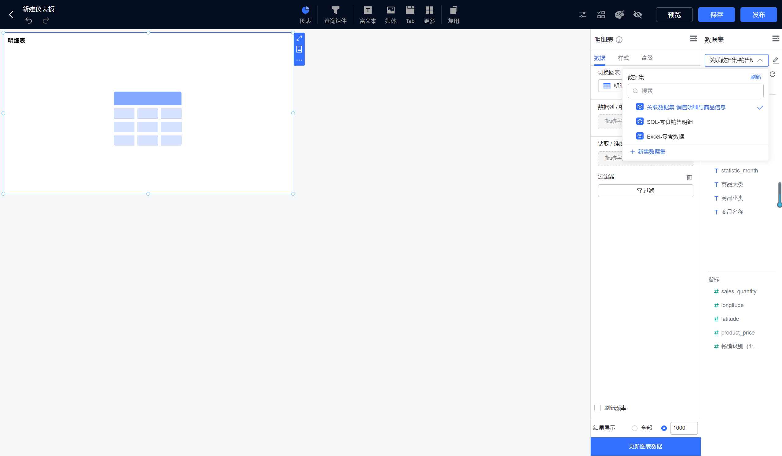 在DataEase中,图表制作是将经过处理的数据集转化为直观、可交互的可视化图形的核心过程。无论您制作何种类型的图表(如柱状图、折线图、饼图或明细表),其创建流程都遵循一套通用且逻辑清晰的步骤。本节将以第7章中创建的"关联数据集"或其他已准备好的数据集为基础,以 "明细表" 这种最直接的数据展示图表为例,详细阐述在DataEase中制作一个图表的完整、通用流程。掌握此流程后,您便可以举一反三,轻松创建其他任何类型的图表。
