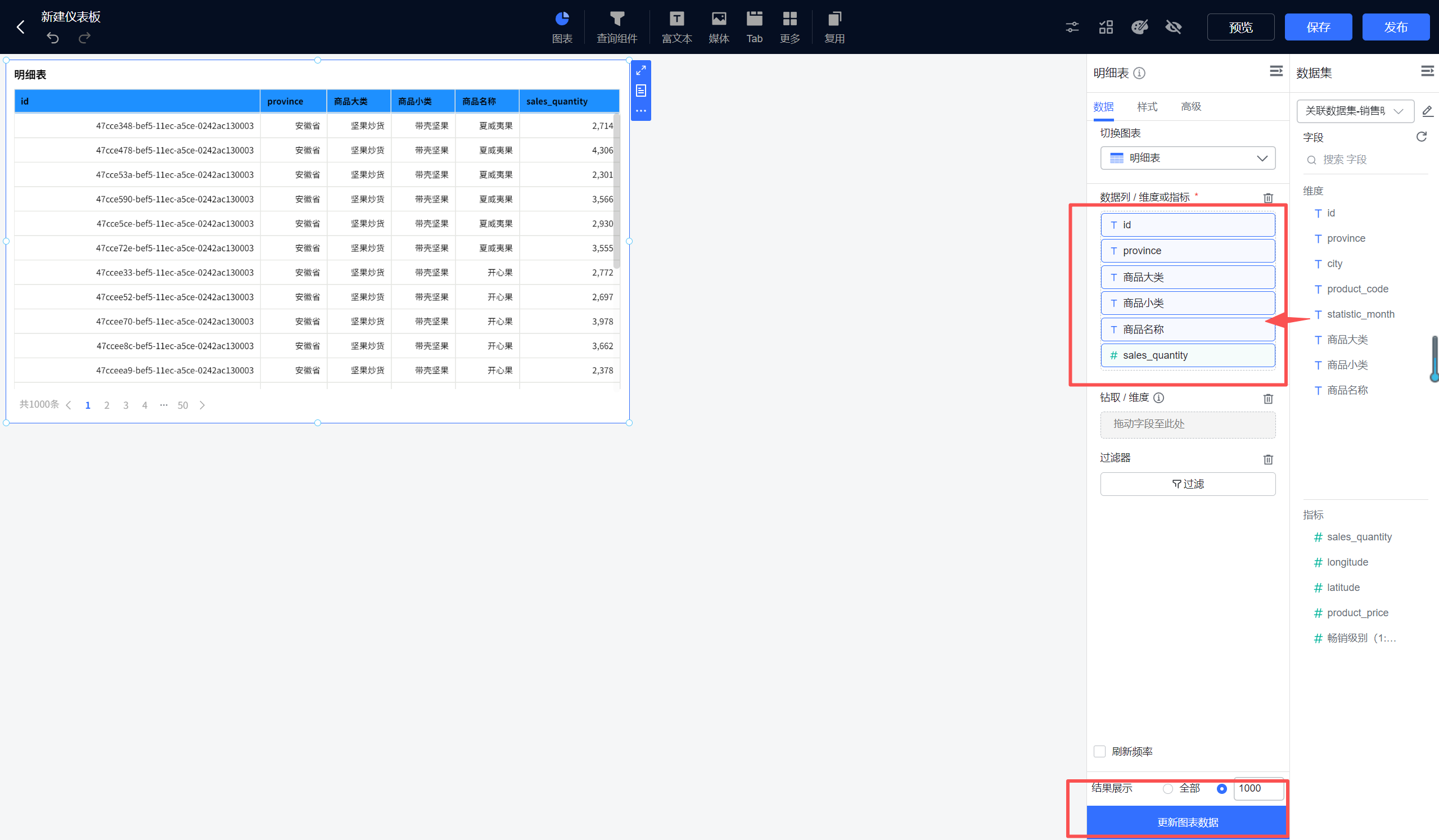 - 在"数据"面板中,您会看到"维度"和"指标"区域。对于明细表,通常将字段拖入 "数据列/维度或指标" 区域。