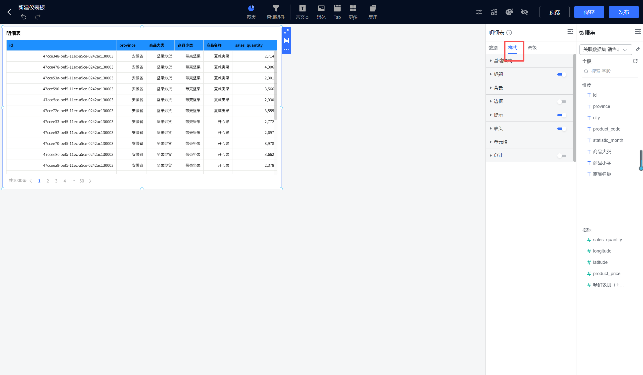 - 单击画布中的明细表组件,其右侧会弹出该图表的 "数据" 配置面板(见图8-6)。
