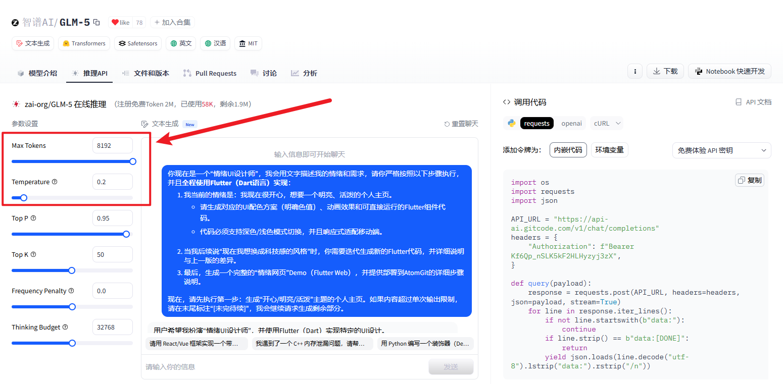 为避免代码截断,结合之前的测试经验,我对 GLM-5 做了针对性参数调整(截图如下):