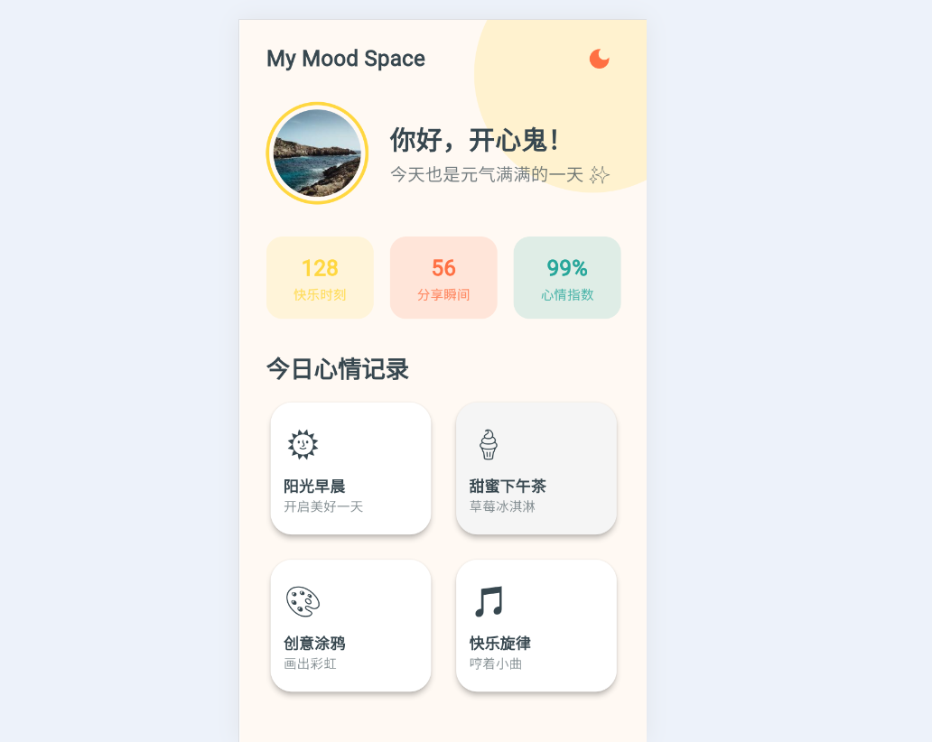 - 统计卡片:用淡色渐变 + 圆角设计,强化活泼感,展示情绪相关数据;