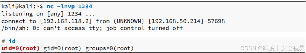 Kali 上的监听器接收到连接,获得目标系统的 root 权限交互式 Shell,攻击完成。