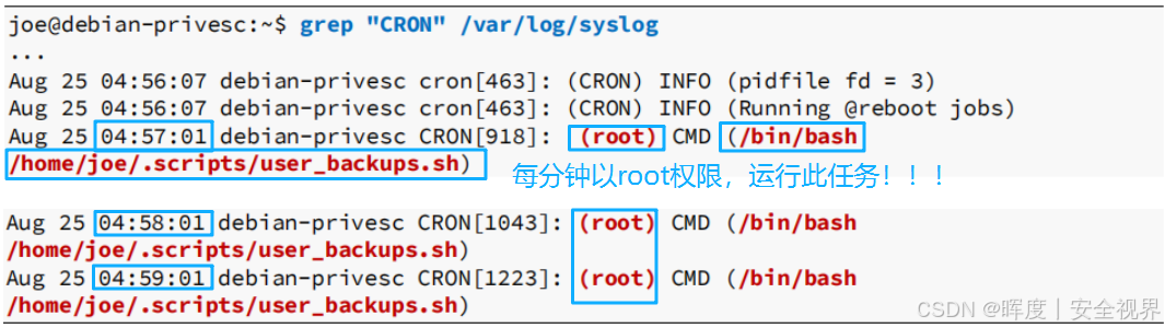 本节聚焦于 cron 作业 ------一个常见的利用点(符合以上的两个特征)。因为系统级计划任务通常以 root 权限 运行,而管理员有时会为这些脚本设置++不安全的权限++。