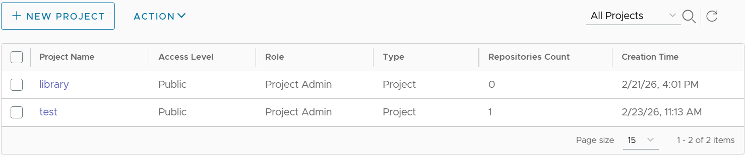 这里的test是Harbor中我新建一个公开项目,默认公开项目是library。你也可以在Web界面中创建更多的项目不同用户来管理不同的镜像集合。如下图所示: