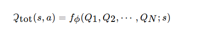 f ϕ f_{\phi} fϕ 是由参数 ϕ \phi ϕ 定义的混合网络,该网络结合了全局状态 s 来指导学习过程。为了确保去中心化执行是可行的,混合网络在每个代理的 Q 值中被约束为单调递增