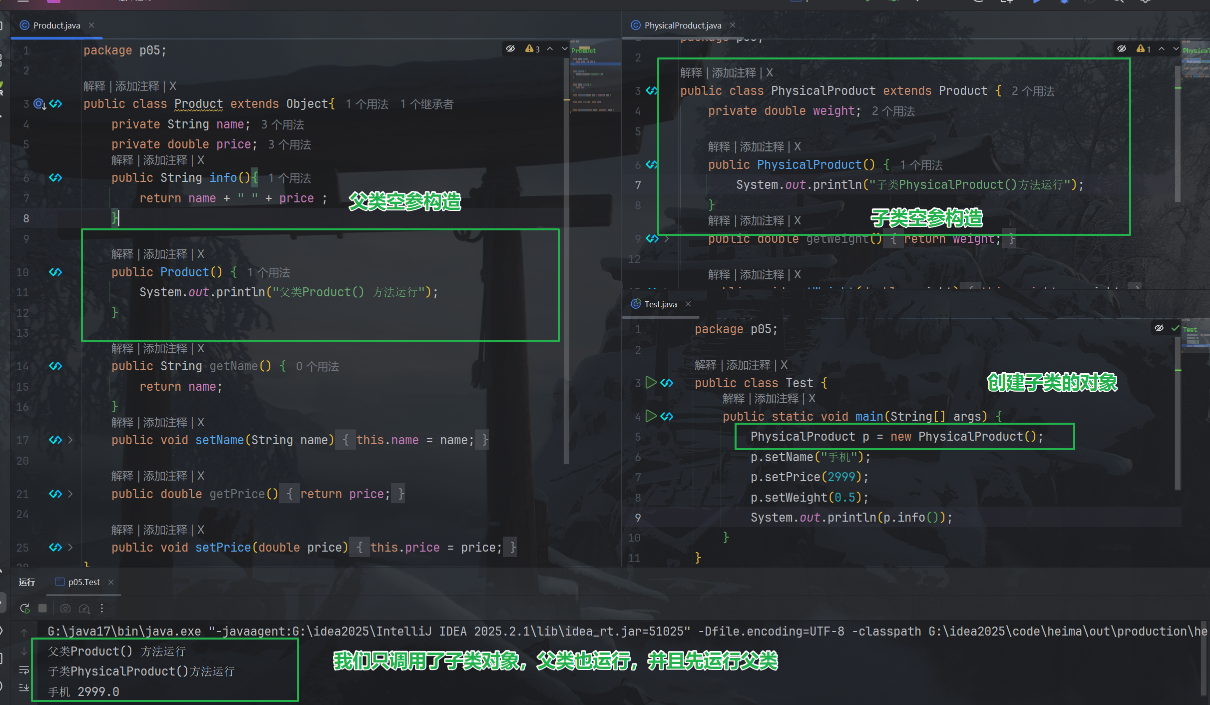 通过有参构造实现调用子类的方法时不会调用父类的方法。