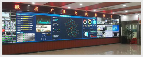 "安徽省应急广播调度指挥综合平台"的大屏,主要以实时的传播信息,数据显示和监控画面为主。实现了互动式多媒体展示界面的开发。